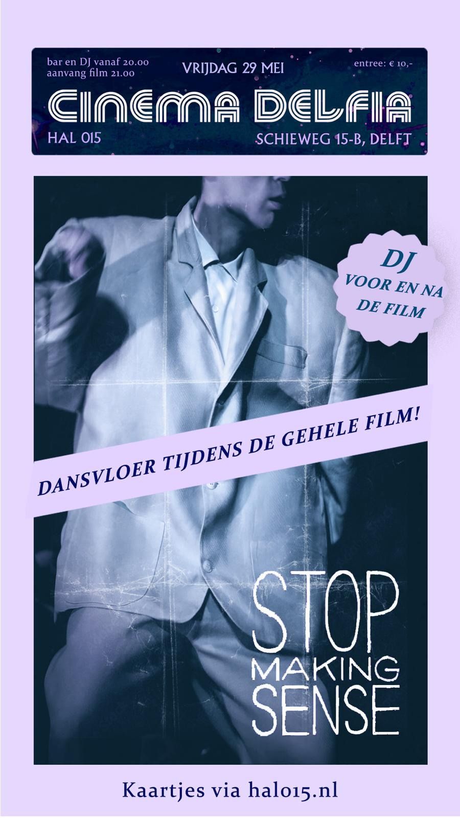 LET OP: Cinema Delfia draait de film Stop Making Sense met dansvloer in het midden van de zaal, en zitplaatsen aan de zijkant. Vanaf 20:00 start het voorprogramma met onze DJ, vanaf 21:00 start de film. Meezingen mag, dansen kan niet anders!