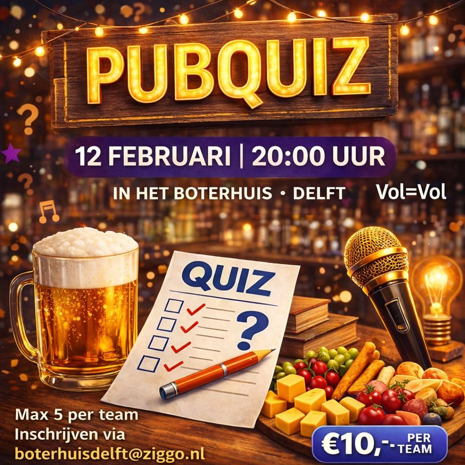 Altijd al eens willen bewijzen dat jij van alles weet? Test je algemene kennis tijdens de leukste pubquiz van het jaar! Kom op 12 februari naar Het Boterhuis met jouw team en maak je klaar voor deze zenuwslopende quiz.